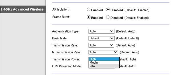 Cài đặt “thấp” đã giảm công suất đầu ra của bộ định tuyến 802.11n của tôi từ 19 xuống 18 watt. Băng thông đã giảm từ mức 19Mbps vốn đã thấp xuống còn 5Mbps với các máy khách và bộ định tuyến của tôi chỉ được ngăn cách bằng một bức tường bê tông.