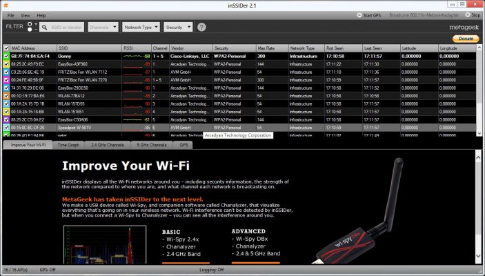 Vào ngày bộ định tuyến của bạn được thiết lập, nó sẽ tự động phát hiện kênh ít đông đúc nhất và đặt kênh đó làm mặc định. Tuy nhiên, với sự xuất hiện của những người hàng xóm hoặc văn phòng mới gần đó, tình hình có thể thay đổi nhanh chóng: Đột nhiên, một kênh có thể được một số bộ định tuyến sử dụng trong khi những kênh khác bị bỏ hoang. InSSIDer là người trợ giúp nhỏ của bạn: Công cụ phân tích toàn bộ phổ Wi-Fi và cung cấp cho bạn thông tin chi tiết về mạng gia đình cũng như việc sử dụng kênh.