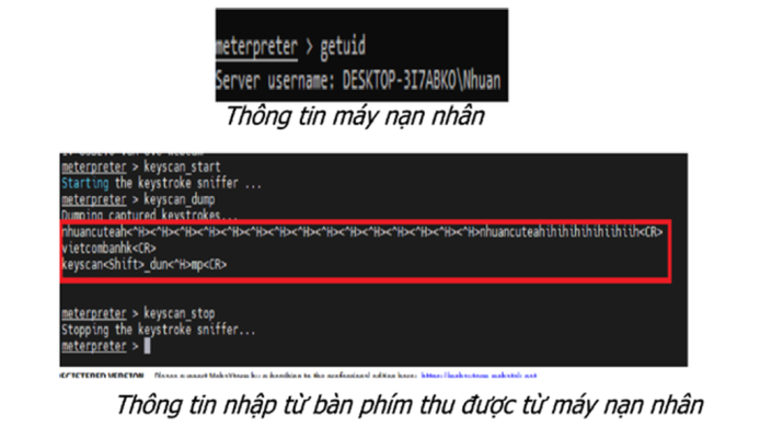Sau khi đã có phiên meterpreter, chúng ta hoàn toàn có thể gõ lệnh help để show ra các lệnh, mục đích để khai thác thông tin máy nạn nhân. Một số kết quả thu được từ máy nạn nhân như sau: